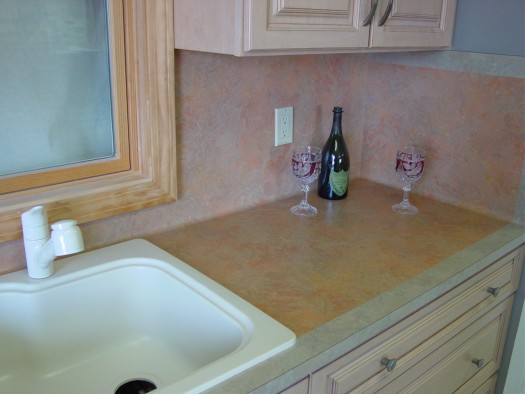 A coved backsplash is the best splash on a laminate top. If it is rolled up to the upper cabinets, you also eliminate the dust ledge at the top of the splash.