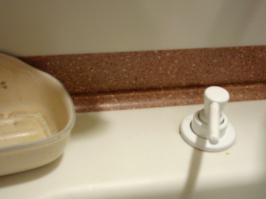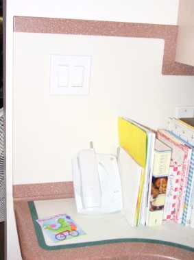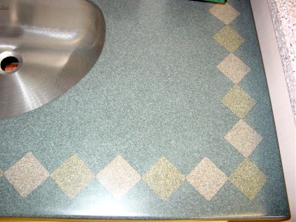 A closer look at the sink area in the above-mentioned kitchen, shows the incorporation of the low-cove (or tile cove) inlay in the border color, joining the wall sheet with the same border. the cove piece allows any standing water to be kept away from any caulked joint, where water may eventually seep through and potentially damage the walls. |